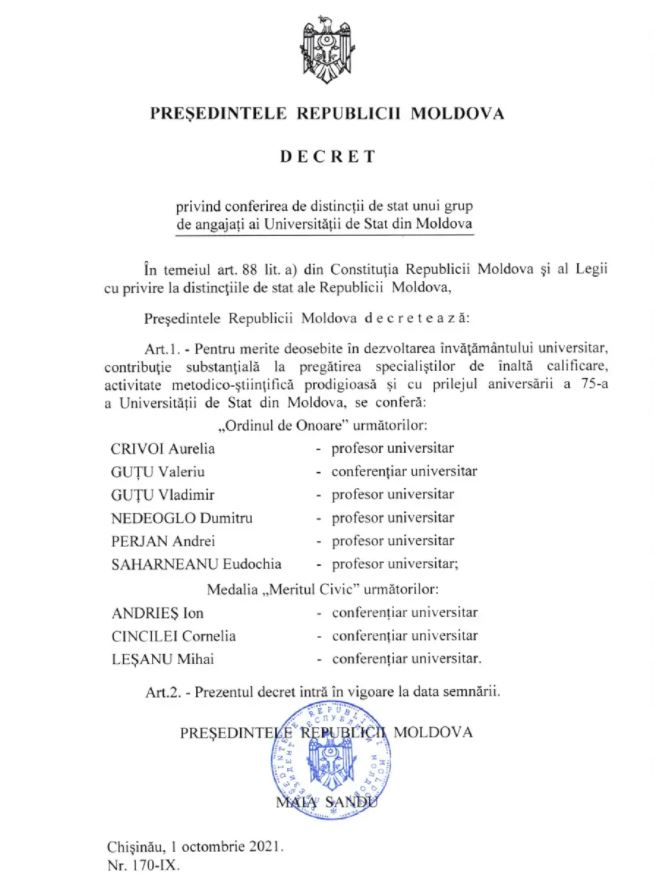 La 1 octombrie 2021, cu ocazia celei de-a 75-a aniversări de la fondarea Universității de Stat din Moldova (USM), prin decretul președintei Republicii Moldova, Maia Sandu: „pentru merite deosebite în dezvoltarea învățământului universitar, contribuție substanțială la pregătirea specialiștilor de înaltă calificare, activitate metodico-științifică prodigioasă” unui grup de profesori și conferențiari ai Universității de Stat din Moldova i-au fost conferite înaltele distincții de stat „Ordinul de Onoare” și medalia „Meritul Civic”.